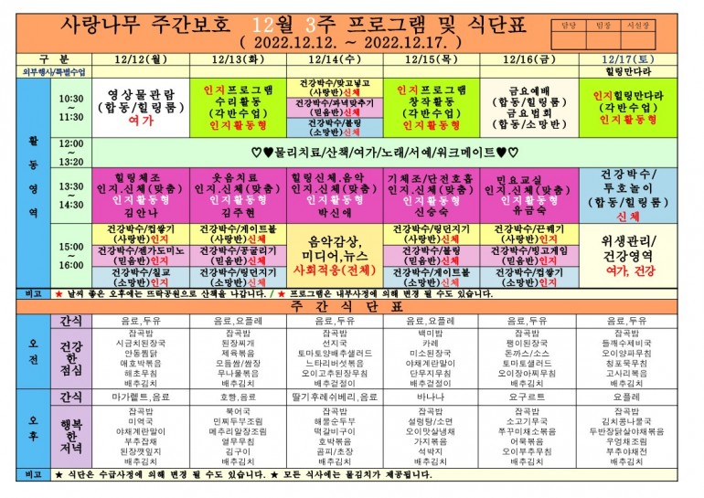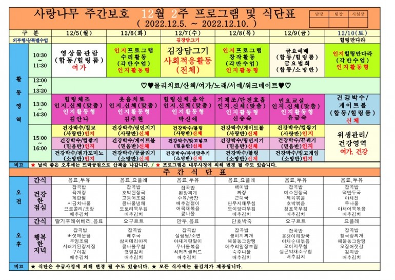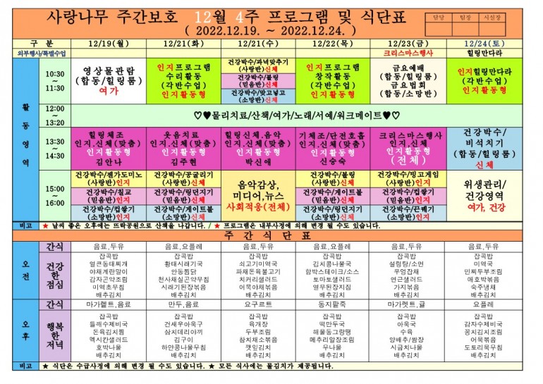 2022년 12월 프로그램 및 식단입니다.