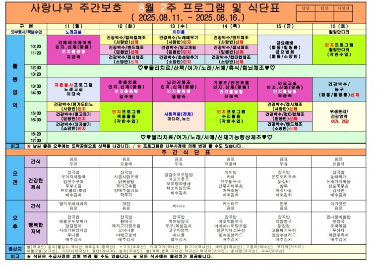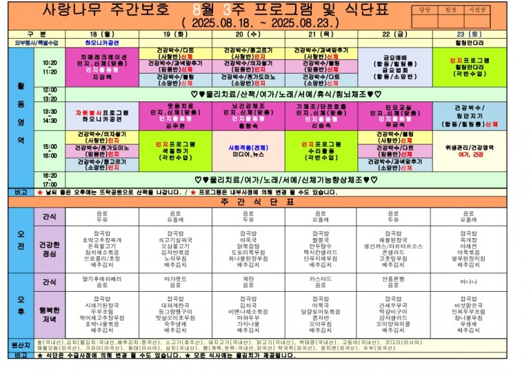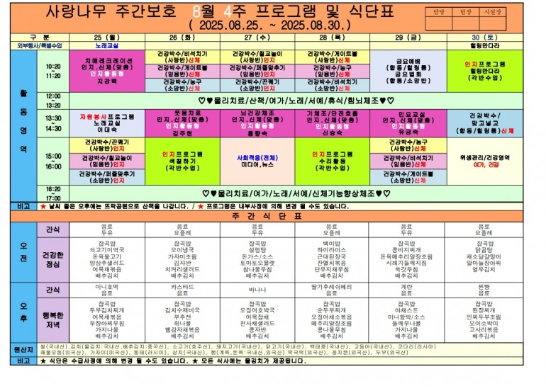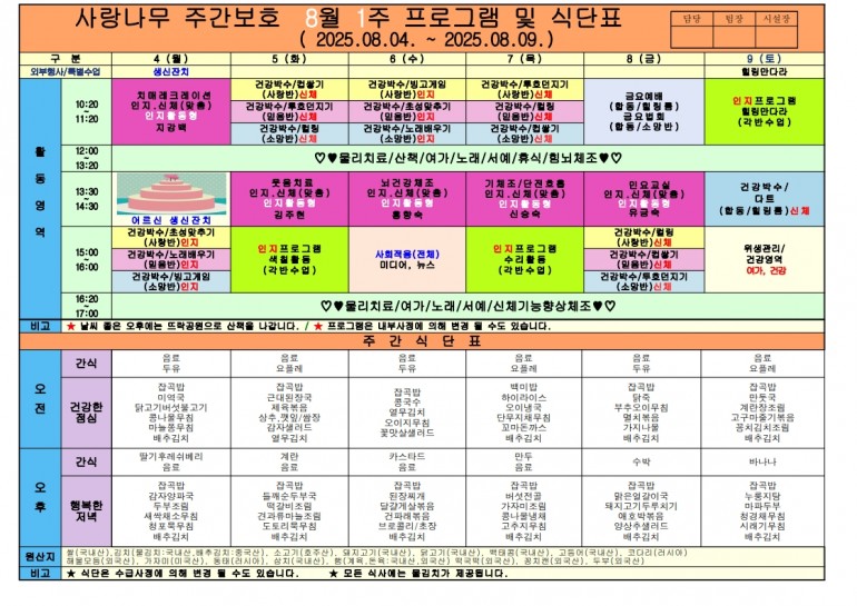 2025년 8월 식단 및 프로그램입니다