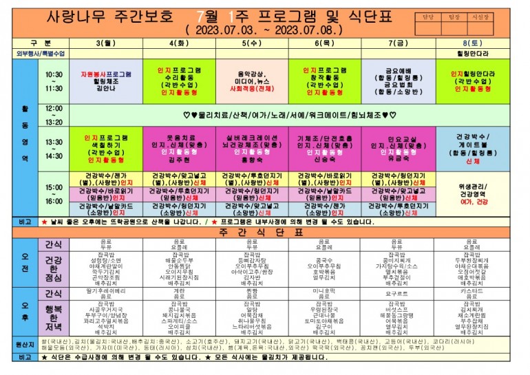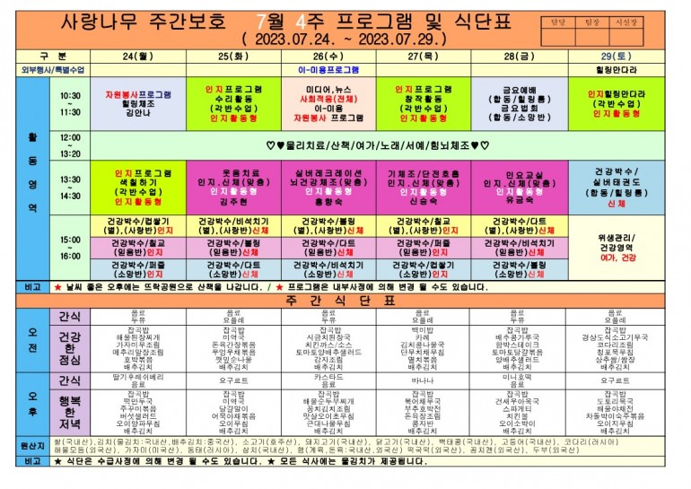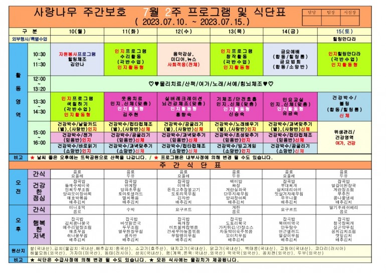 2023년 7월 식단 및 프로그램입니다.