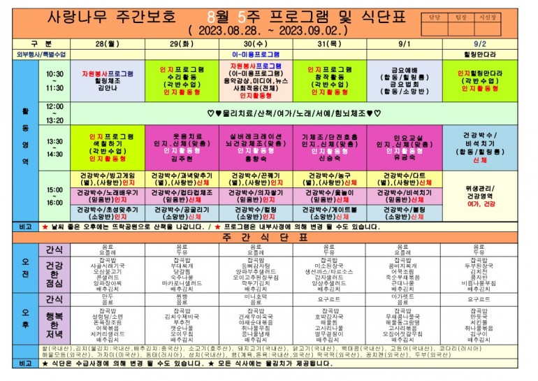 2023년 9월 식단 및 프로그램입니다