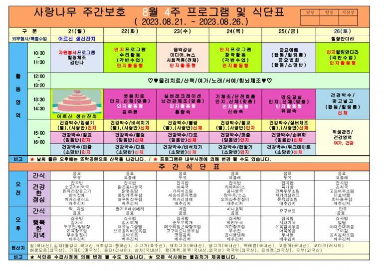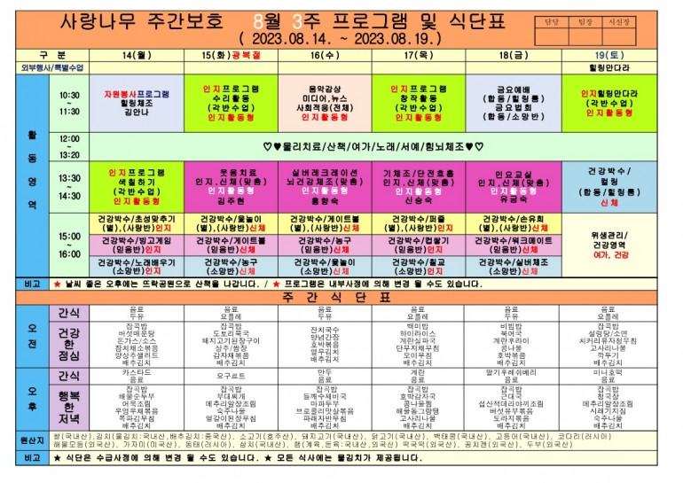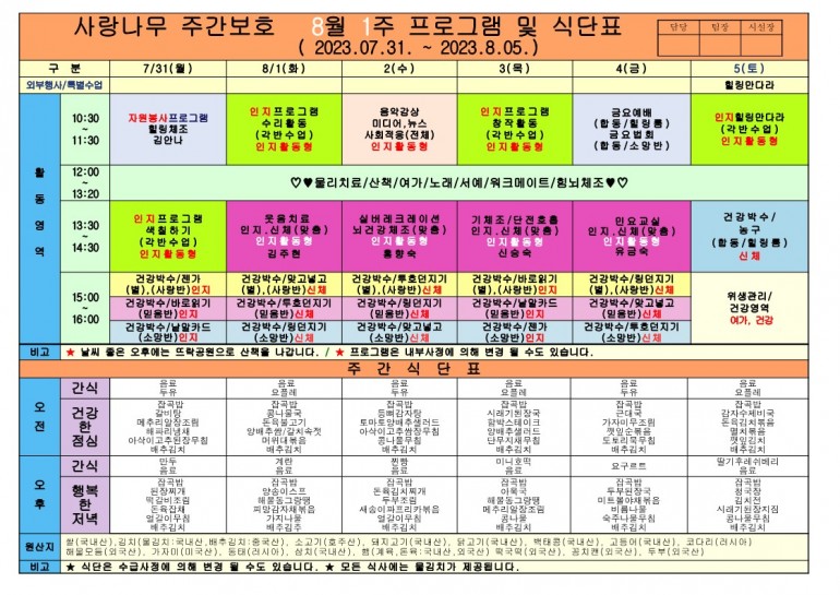 2023년 8월 식단및 프로그램입니다.