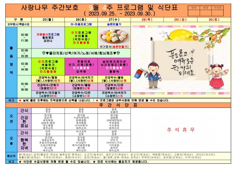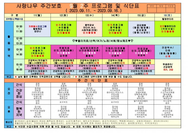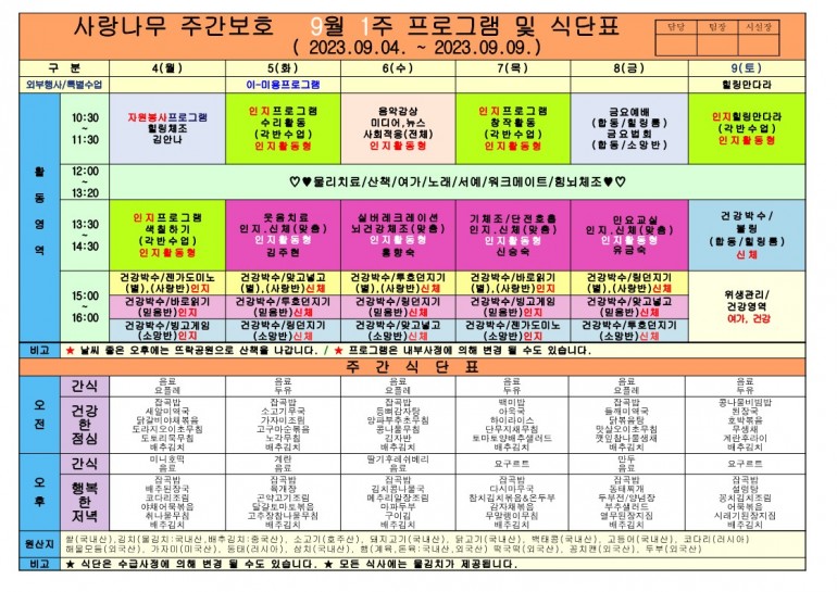 2023년 9월 식단 및 프로그램입니다